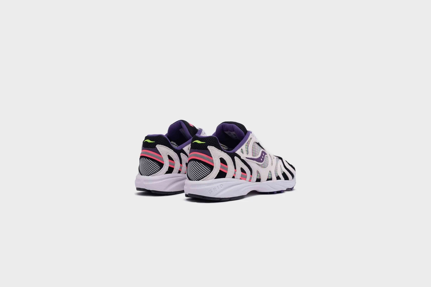 The latest incarnation of Saucony’s reborn Grid Azura 2000 is inspired by vintage Bozozku street and long nights out in Tokyo on the Grid Azura 2000 “Tokyo Mornings”. The lightweight runner uses recycled multicolor woven lace in the underlays, giving off a vibes of washed out neon lights seen on a blurry “morning after,” layered with translucent mesh and phantom white suede overlays in a tiger stripe pattern. Black suede and pink neon accents balance the composition, while reflective taping, a white foam midsole featuring neon GRID technology, and a black, white, pink and purple rubber outsole caps off the design.
